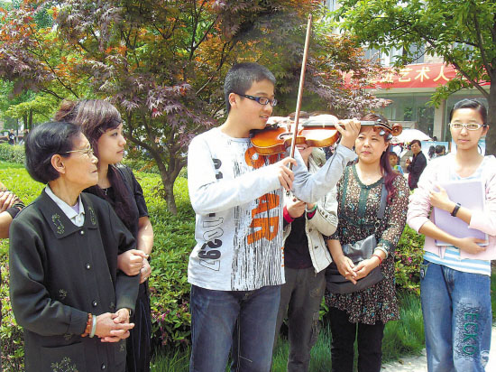 来自温州第二实验中学的潘聪润报考小提琴演奏,他们一家四代8个人都赶来为他助阵。 丁星云 摄