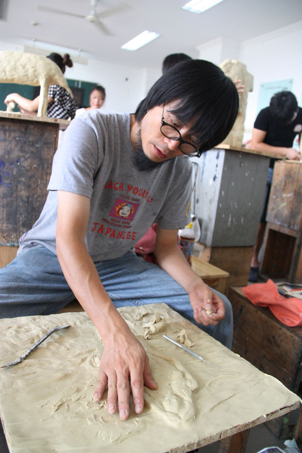 老师的课有时候也很不轻松,他对作品的质量要求很高,觉对不会让我们敷衍了事,像这次的雕塑课,虽然只有短短的两周时间 ,但我们的作品却经过了多次的修改,从最初的定型,到最后的修饰。老师都仔细地指导、查看,并亲身示范和修改,就像一个艺术家对待自己的作品一般认真。