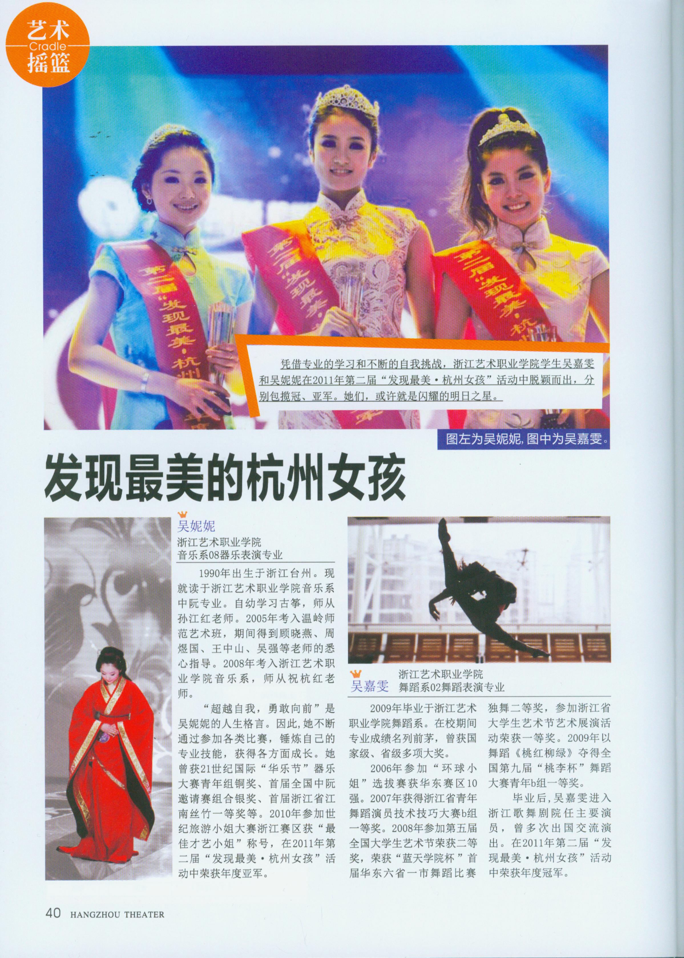 毕业后,吴佳雯进入浙江歌舞剧院任主要演员,曾多次出访国外交流演出。在2011年第二届“发现最美·杭州女孩”活动中荣获年度冠军。