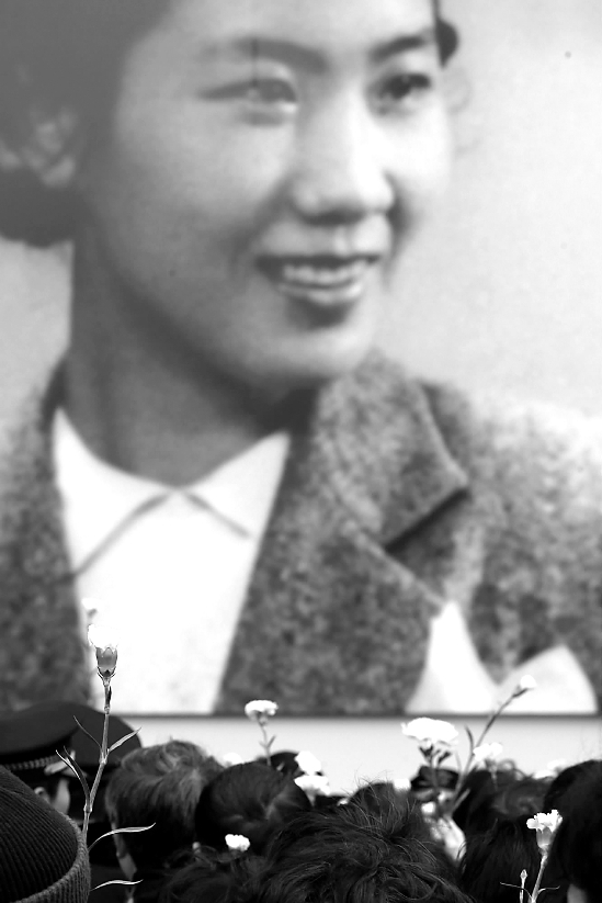 “感怀一曲断肠夜,知音千古此心同,尽在不言中。” 袁雪芬安卧在龙华殡仪馆大厅中央的白色玫瑰台上,耳旁环绕的不是哀乐,而是她在越剧《西厢记》中的知名唱段《琴心》;大厅外的广场上,戏迷们拉起的挽联与之交相辉映:“雪声已成千古绝唱。”