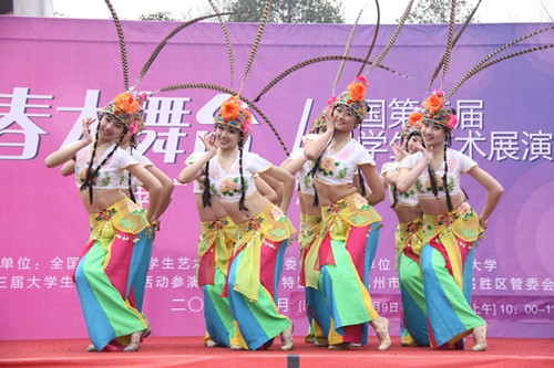演出当天气温下降到零度。同学们到达现场时,舞台上的红毯已凝结了一层薄薄的冰面,工作人员正在进行紧张地清理,但即便是天寒地冻,又怎挡得住青春的热血澎湃。舞台上,大学生们翩翩起舞。《溜溜的康定溜溜的情》、《俏花旦》、《花儿》三个舞蹈都是由女孩子来完成的,她们婷婷玉立,婀娜起舞,令人顿生美不胜收之感。反观男子群舞《狼图腾》、《维吾尔人》,演出服装更为单薄,连观众都冻得直跺脚的低温下,这些男孩子硬是咬牙坚持,翻滚跳跃,一招一式,毫不含糊。