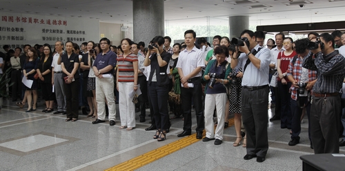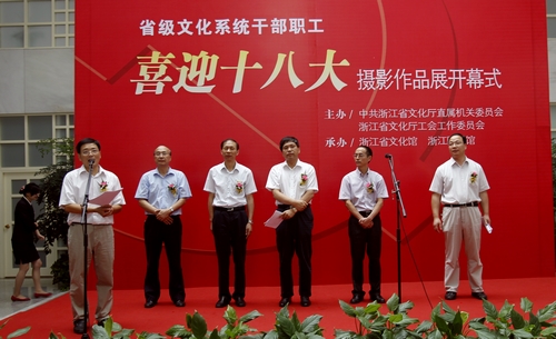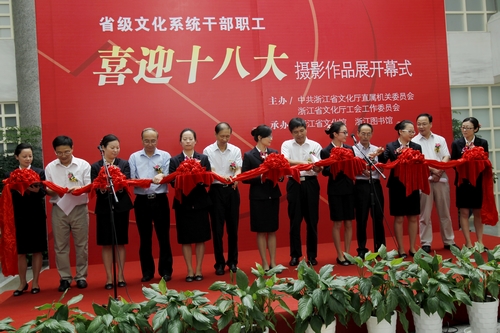 在全省上下创先争优、喜迎党的十八大胜利召开之际,浙江省级文化系统干部职工喜迎党的十八大摄影作品展于9月26 日上午在浙江省图书馆在简短而隆重的开展仪式上,省文化厅党组副书记、副厅长金兴盛出席并致辞,与省文化厅直属机关党委专职副书记胡雁,浙江省图书馆馆长、党委书记应长兴,省文化馆党总支书记省文化厅工会工作委员会副主任汪樟德等领导共同为开幕式剪彩。我院副院级调研员、院工会主席张锦才和教工代表出席仪式。