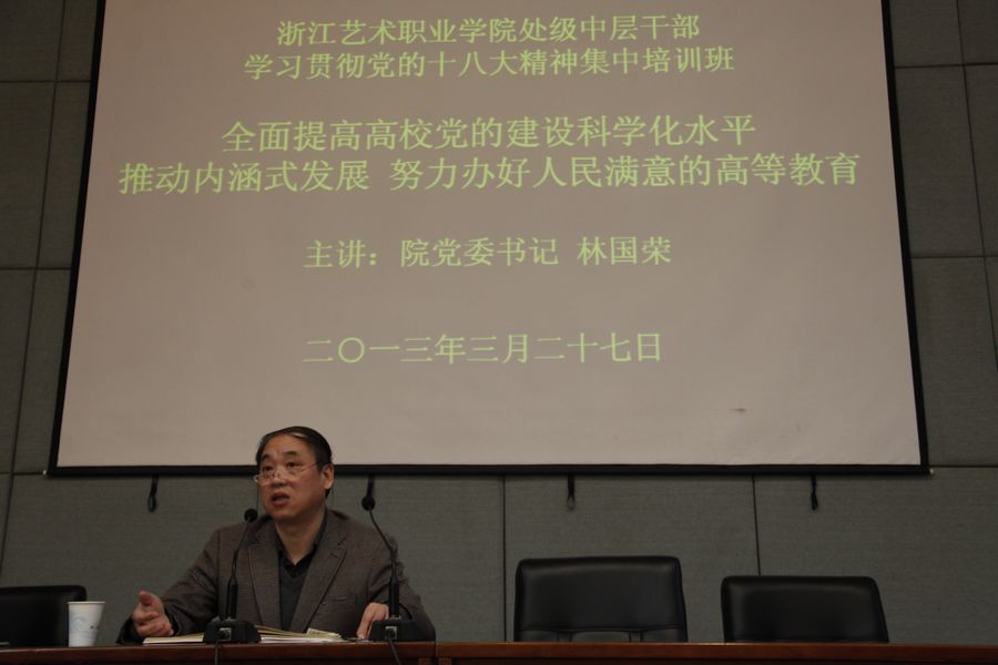3月27日,浙江艺术职业学院党委书记林国荣在图信中心报告厅作题为《全面提高高校党的建设科学化水平,推动内涵式发展,努力办好人民满意的高等教育》专题讲座,由此拉开为期一个月的浙江艺术职业学院处级中层干部学习贯彻党的十八大精神集中培训班的序幕。