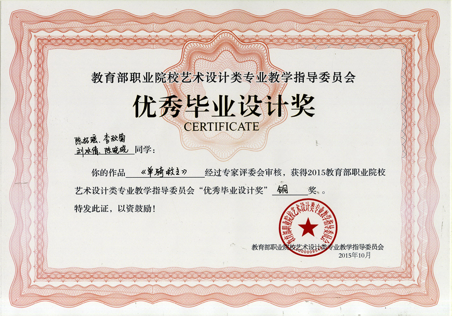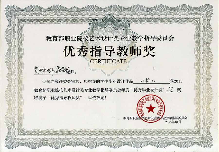 11月8日,在湖南工艺美术职业学院举行的2015教育部职业院校艺术设计类专业教学指导委员会评审现场传来喜讯,经教育部职业院校艺术设计类专业教学指导委员会评审,美术系教师贾娜娜、孙煜珑指导的定格动画作品《拆》获“优秀毕业设计奖”金奖,贾娜娜指导的定格动画作品《单骑救主》、孙煜珑指导的三维动画作品《如果·爱》获“优秀毕业设计奖”铜奖,娄旻的课程《图形创意设计》获第六届青年教师讲课竞赛“金教鞭”奖金奖,贾娜娜、孙煜珑获“优秀指导教师奖”。