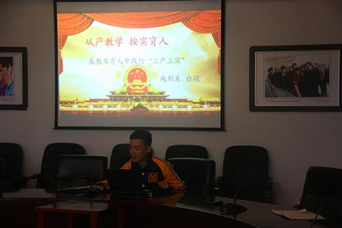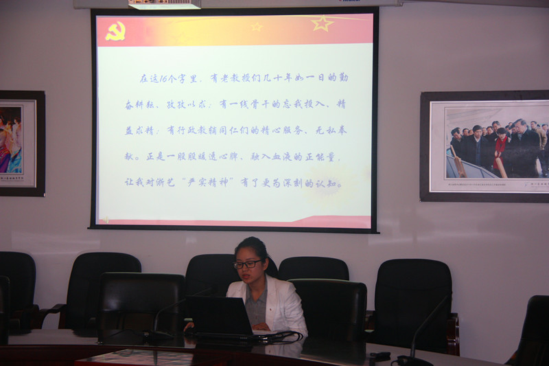 围绕谋事创业专题教育,音乐系党总支副书记章蔓丽、教务处教务科科长吴颖、戏剧系青年党员白骏分别以《在践行“三严三实”中实现文艺工作者新形象》《怀着大爱做小事凝聚浙艺正能量》《从严教学 按实育人——在教书育人中践行“三严三实”》为题向全体与会人员开展了专题党课,以身边的典型人物为例,就如何践行“三严三实”要求做了具体阐释。