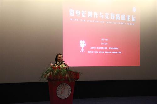 院长张建国在论坛致开幕辞。他回顾了我院微电影创作成果,起步早,成果丰硕,自2010年至今已经举办了五届微电影大赛。这5年中,我院师生摄制了各种影视作品达100多部,其中有近20部获省及省以上奖励,这些成果离不开各级领导和业内人士的关心与支持。他希望与会专家能就影视多媒体创作与办学的进一步衔接开拓,一如既往地给予我院支持与指点。