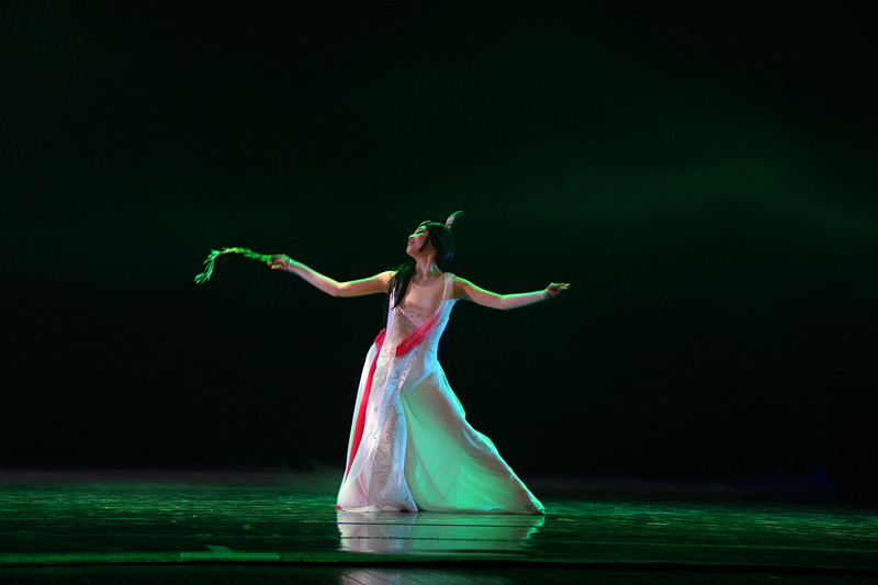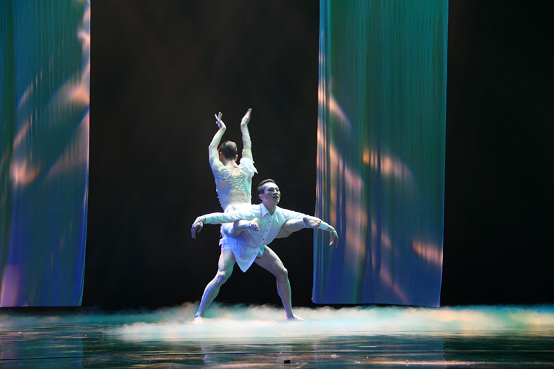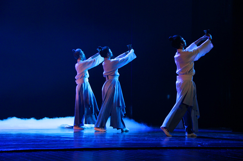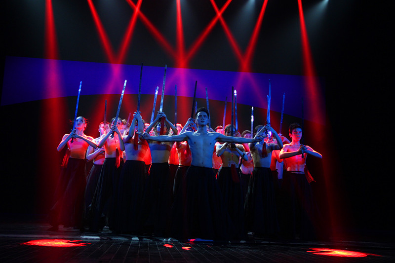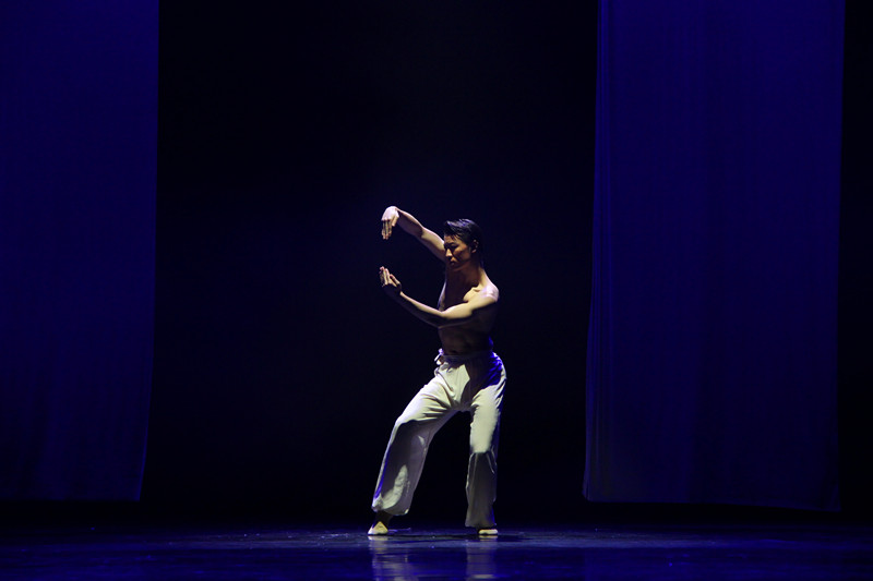 第三篇章是“念心”,用心和他人交流、用心和世界对话、用心去感悟理想或者本源。“这个章节的第一个舞蹈是《我心中那只鹤》,我用鹤代表理想,需要实现就要插上翅膀;第二个舞蹈是《对话》,这是个纯舞蹈,是舞蹈本体美的展示,是肢体语言的抽象与提炼,通过手和肩膀的交流,手和手的交流,手和脚的交流来说话;第三个《心之剑》是去年舞剧的片段,一把剑的炼成过程也就是韩信个人的成长过程,每个人应该都有一把这样的剑。”包峥剡在“念心”中让自己的想象力奔流而出。