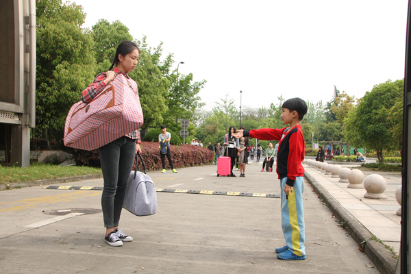 校门口出现了这一幕,小男孩为提着行李的大姐姐伸出了援助之手,这正是校园正能量的传播