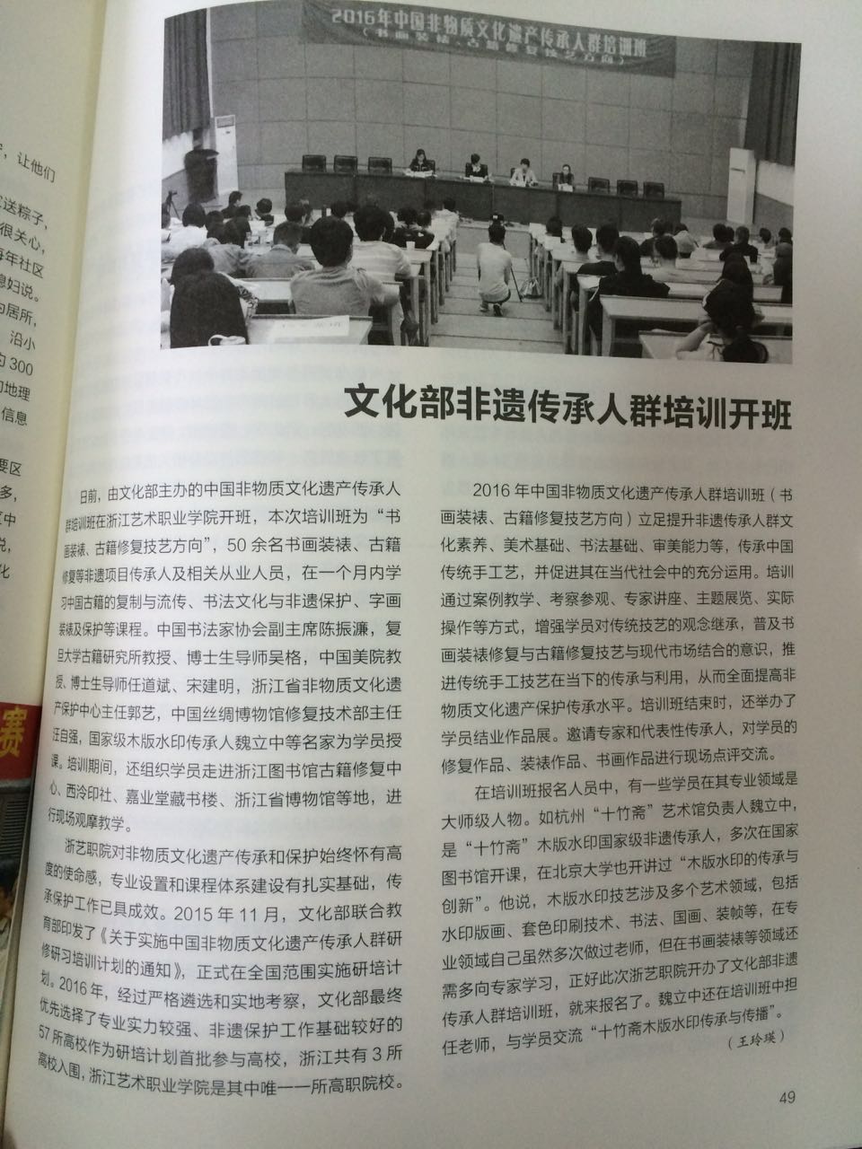 2016年中国非物质文化遗产传承人群培训班(书画装裱、古籍修复技艺方向)立足提升非遗传承人群文化素养、美术基础、书法基础、审美能力等,传承中国传统手工艺,并促进其在当代社会中的充分运用。培训通过案例教学、考察参观、专家讲座、主题展览、实际操作等方式,增强学员对传统技艺的观念继承,普及书画装裱修复与古籍修复技艺与现代市场结合的意识,推进传统手工技艺在当下的传承与利用,从而全面提高非物质文化遗产保护传承水平。培训班结束时,还举办了学员结业作品展。邀请专家和代表性传承人,对学员的修复作品、装裱作品、书画作品进行现场点评交流。