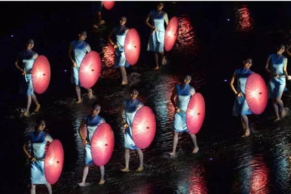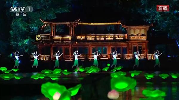第八个节目《难忘茉莉花》,有熟悉的旋律,也有新的节奏。姑娘们身穿旗袍,旋转着有江南特色的纸伞,在湖上演绎茉莉花“月下遗世独立”,“杯底流暗香”的情镜。
