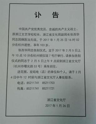 2017年1月25日16时02分,原浙江省文化局副局长、浙江文艺学校校长张西华同志,因病医治无效在杭州逝世,享年103岁。