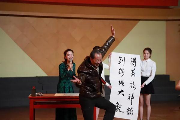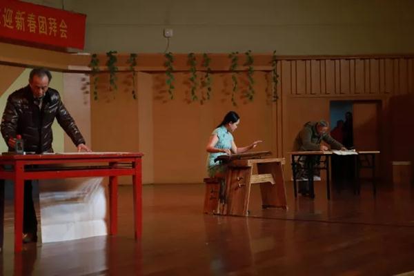 现场配乐书画创作掀起了一个高潮,浙艺老领导李人麟、老教师杨宝鸿现场进行书画创作,音乐系教师高珊古琴演奏《梅花三弄》《流水》。书之画之,兴致所至,李人麟手舞足蹈起来,舞之蹈之,舞姿与书法齐飞……红船在浙江,浙江有担当。《红船,从南湖起航》由老教师胡素银、沈从文朗诵,他们即兴带来的歌曲《绒花》把演出带入新高潮。黄爽的女声独唱《中国进入新时代》为浙艺老同志迎新春团拜会画上圆满句号,昭示着2018浙艺和祖国一起走进新时代。