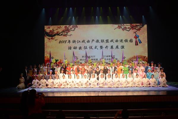 “送好一场戏”,传播戏曲审美。2018年4月,学校牵头浙江戏曲产教联盟成员单位举办了戏曲进校园活动出征仪式暨开幕展演,汪世瑜、朱元昊、刘建杨、陈晓红等戏曲名家向现场近千名大中小学生普及了各剧种历史、渊源和特色;联盟单位联手推出昆剧、越剧、绍剧、婺剧等经典剧目和精彩演出。下半年,学校组织戏曲专场走进舟山市普陀小学、上虞重华小学、杭州长江小学、杭州实验明珠中学、浙江育英职业技术学院等学校开展进校园演出共计29场,师生观众达3万余人次,让学生们近距离感受戏曲艺术所蕴含的中华文化之美,越学越有戏。