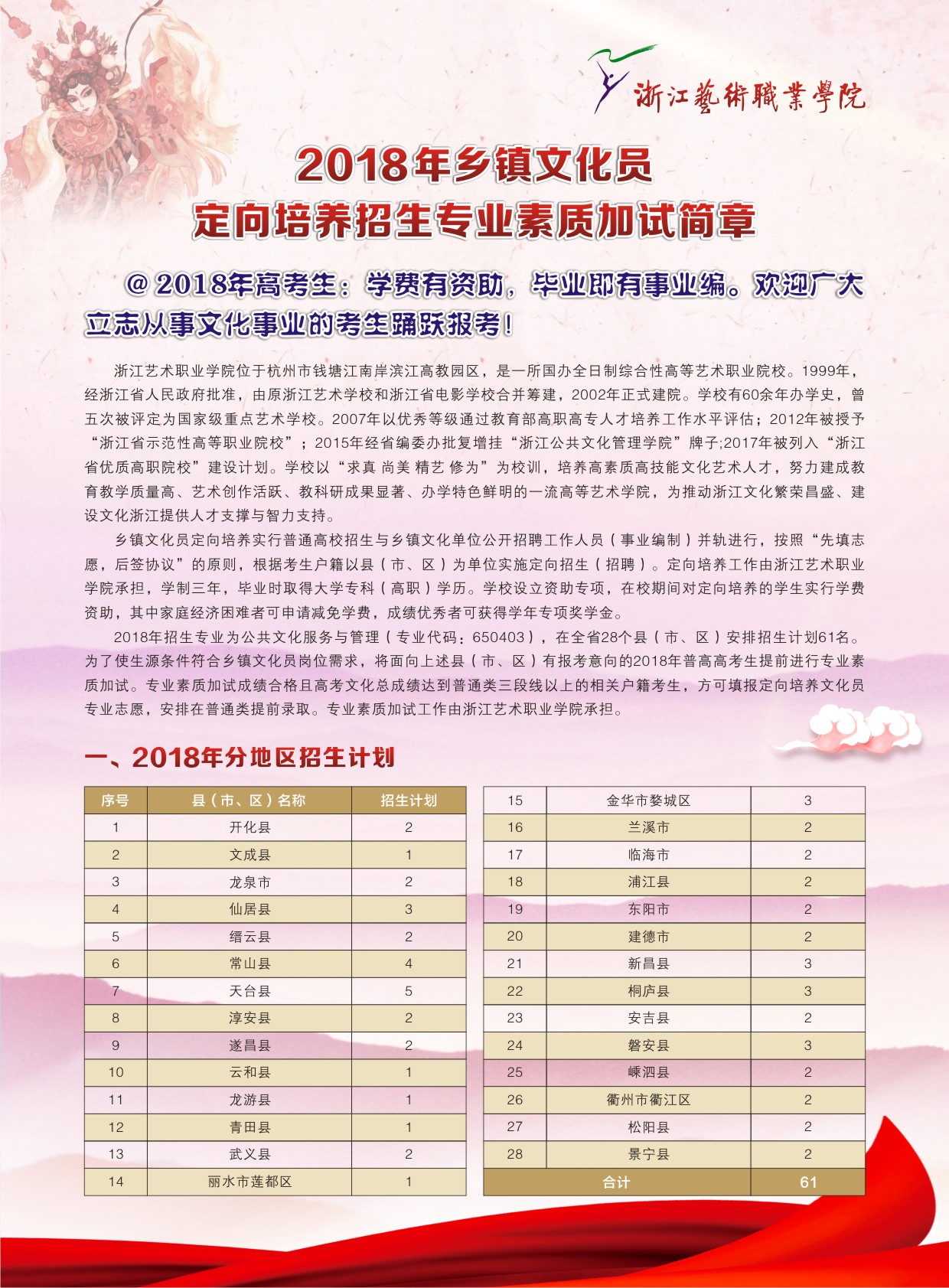 开展乡镇文化员定向培养工作,是为了解决当前我省基层文化员队伍存在的“不足、不专、不稳”问题,是新时代振兴乡村文化的需要。欢迎有志于服务基层公共文化事业且具有一定艺术特长的的考生积极踊跃的报考。