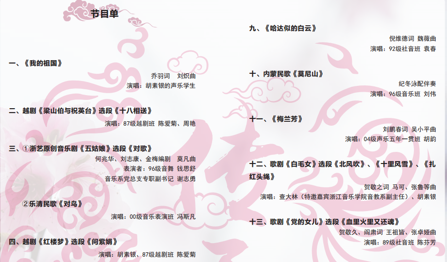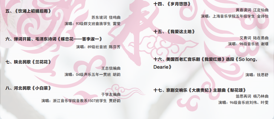这场“音乐大讲堂”,选取的都是听众耳熟能详的曲目,甚至还有越剧选段。“在我的认知中,浙江戏曲和本土音乐一直是互相汲取养分,你中有我,我中有你的。戏曲,从广义上说属于音乐戏剧的类型,她是中国式的、具有民族特点的音乐戏剧。我刚进浙江艺术学校当老师,最先教的就是越剧专业学生的声乐。”胡素银说,把浙江地方戏曲元素放进这场“大讲堂”,不仅是她的音乐理念,也是一种从教纪念。