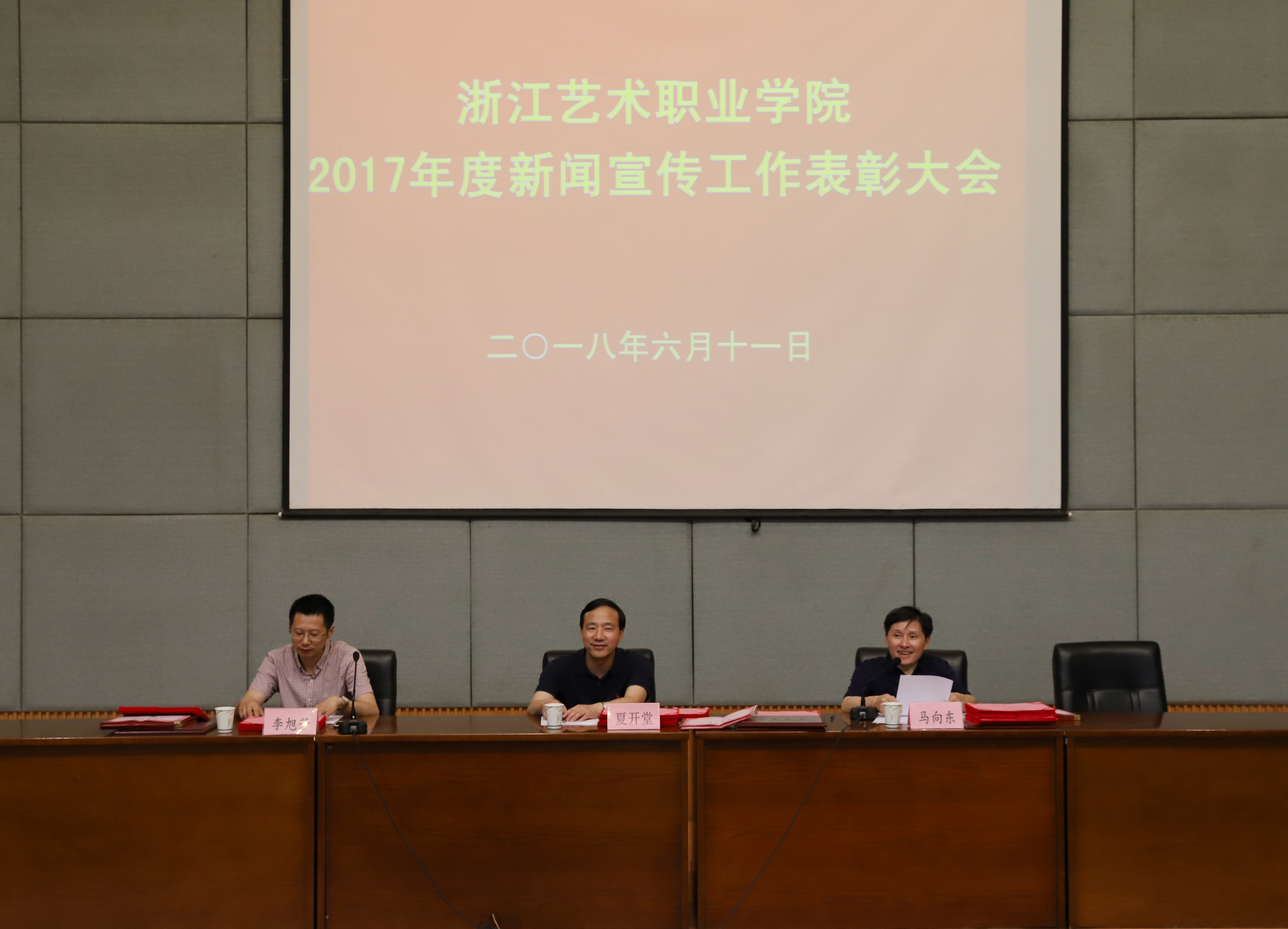 马向东作2017年学院新闻宣传工作总结。2017年,学校喜趁十九大东风,宣传党的方针政策和学校发展大计,培育社会主义核心价值观,传播最美浙艺,弘扬正能量。在这一年中,浙艺新闻宣传工作蓬勃发展,学校成功承办了第24届中韩日戏剧节,参演浙江省喜迎十九大暨庆祝建党90周年交响音乐会、第十三届全国学生运动会开幕式演出、浙江省·静冈县结好35周年庆祝演出、全省大学生艺术节、省音舞节等重大活动,全校各系各部门教工通讯员和学生记者相互配合,撰写了大量的宣传报道,拍摄了大量新闻宣传图片,使学校和各系各部门在教育教学、科研创作、党建思政、校园文化和服务社会等各方面取得的优异成绩和发展状况得到及时展现和传播,为宣传学校形象增光添彩,取得了广泛的社会影响。此外,参加全省高校校报评比取得历史性突破,官方微信、微博等校园媒体的关注度和阅读量在全省高职类院校中名列前茅。学生记者团在全省高校媒体评选中取得佳绩。