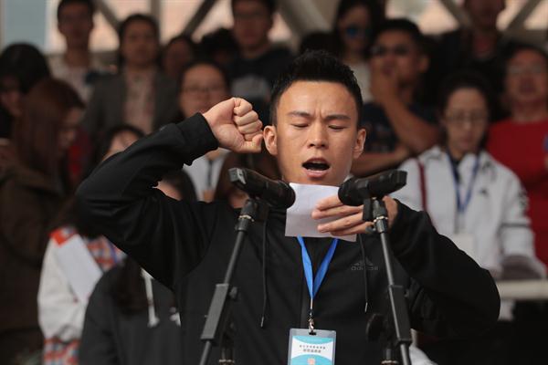 文管系18级民传学生王漂洋、教师张耀文分别作为运动员代表和裁判员代表上台宣誓。