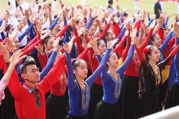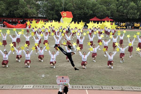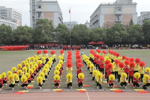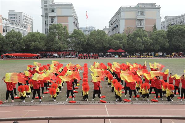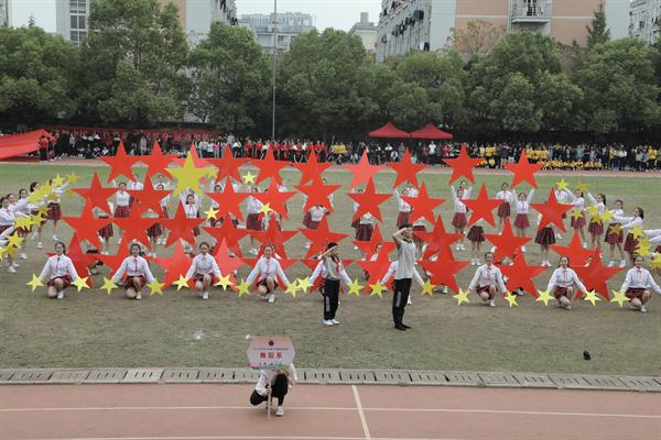每年运动会开幕式,团体操是最受期待,最受瞩目的环节。本届团体操比赛,各系将新中国成立70周年主题融入团体操编排,通过国旗、红飘带、五角星、向日葵、体操球等元素融入,呈现了一场别样的主题展示。音乐系的团体操《天耀中华》,有演唱有舞蹈有打击乐,场面宏大,元素丰富,不仅有给新中国成立70周年的生日祝福,也展现了“不忘初心、牢记使命”的责任担当。舞蹈系手持五角星闪闪发亮,由中专和大专学生配合的技能展示,体现了浙艺精神代代相传,一颗红心向党走,少年有梦在远方。戏剧系通过七色各不相同的服装,大大的气球,拼出“梦”“艺”“70”等字样,将浙艺校歌《梦想开始的地方》和《我和我的祖国》结合在一起,寓意艺术融入大时代。美术系、影视技术系、文化管理系均进行了精彩展示。
