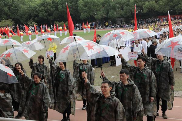 党委副书记夏开堂宣布浙艺第16届田径运动会开幕。运动场上一片欢腾,运动健儿蓄势待发。运动员们昂首挺胸行至主席台前,用昂扬的姿态展现独特的风采。文化管理系入场式展现了“红色梦想”,体现守初心、担使命的时代精神。舞蹈系的入场展示了民族团结、文旅融合,学生穿着维吾尔族、藏族、朝鲜族、畲族等少数民族服饰,伴着欢快的音乐,热情洋溢地舞动起来。影视技术系师生手持火炬,以红色电影月幕布为背景,展示专业特色,表达了争做新时代红色影视追梦人的愿望。音乐系老师手握红旗,学生手拿向日葵,朝气蓬勃、青春焕发,跟着音乐节拍走过新中国成立重要节点。美术系老师的雨披、雨伞上红星闪耀,致敬中国共产党历带领中国人民历经磨难走向新时代,也展现了美术系不惧风雨,不忘初心,牢记使命,一路向前的决心。戏剧系学生红色水袖飞舞,以戏曲舞蹈展现了浙艺人传承中华优秀传统文化的决心和担当,结合“传承红色基因,做红色戏剧人”活动,表达戏剧人“不忘初心使命,勇立时代潮头”精神。