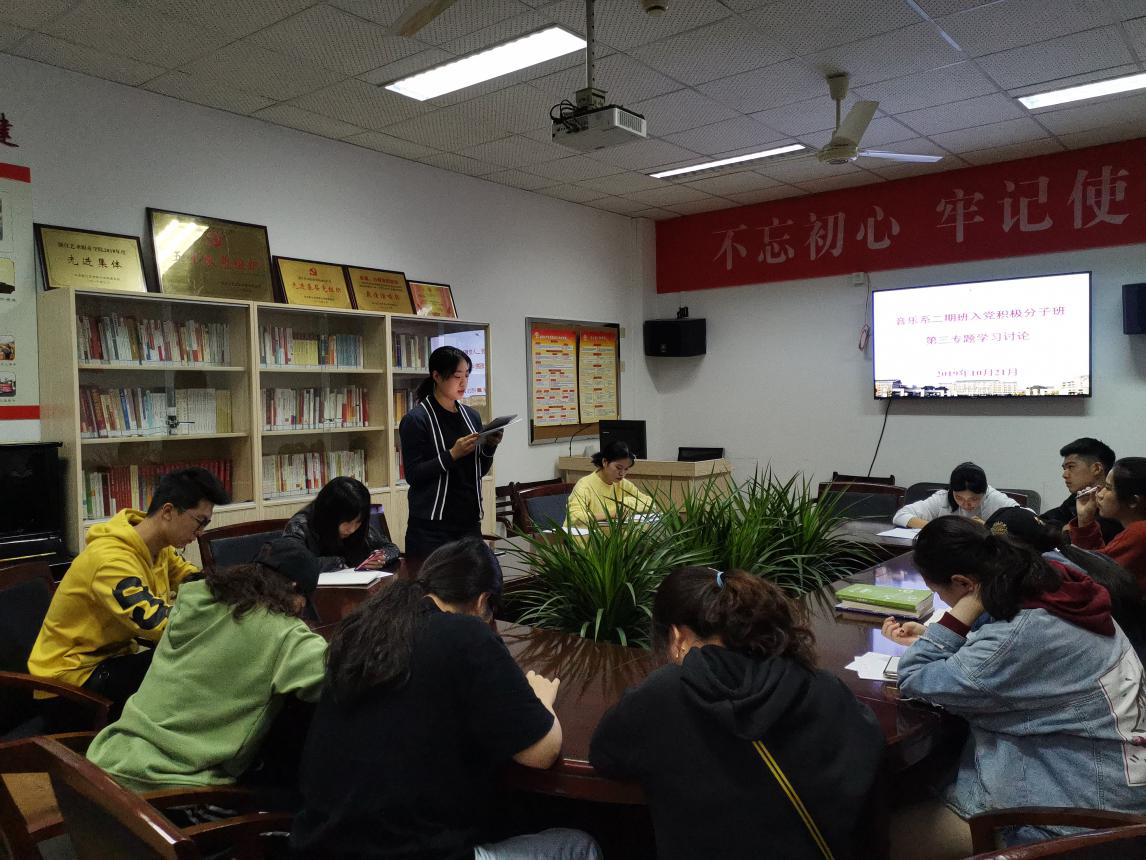 10月21日晚,音乐系第二期入党积极分子培养班在系党员之家活动室举行第三次专题学习讨论,围绕“不忘初心,牢记使命,查摆不足,诠释入党动机”进行交流。