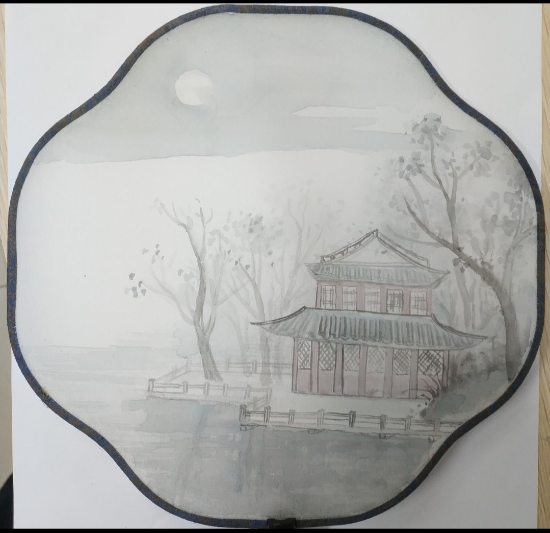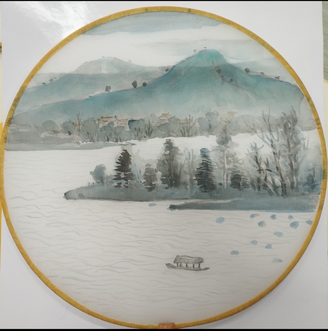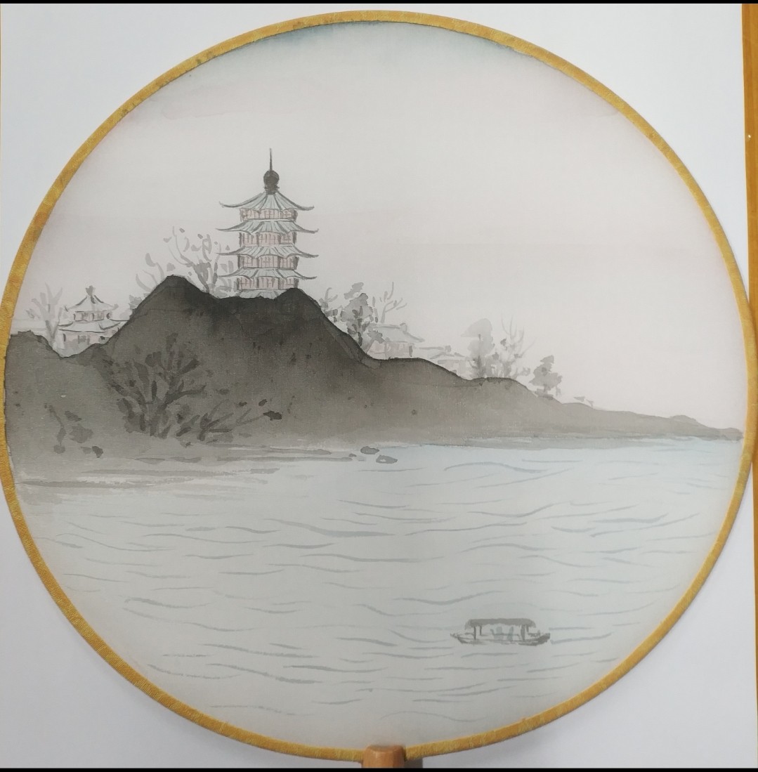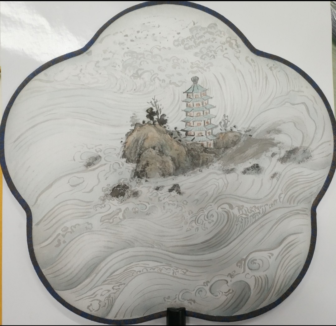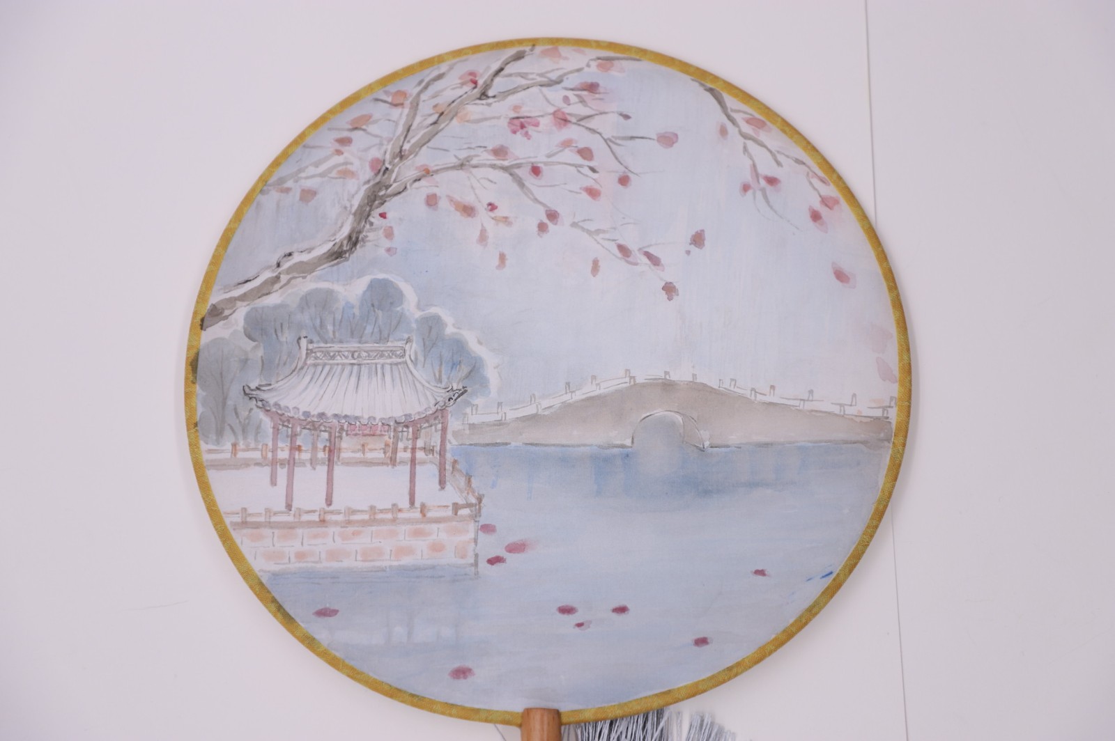 书画团扇绢画兴起于南宋宫廷画院,南宋院体的绘画手法也能诠释我们印象中西湖之美、杭州之盛。细节上,我们继续采用山水画勾勒具有杭州十二景中的亭台塔桥和狂浪静湖。