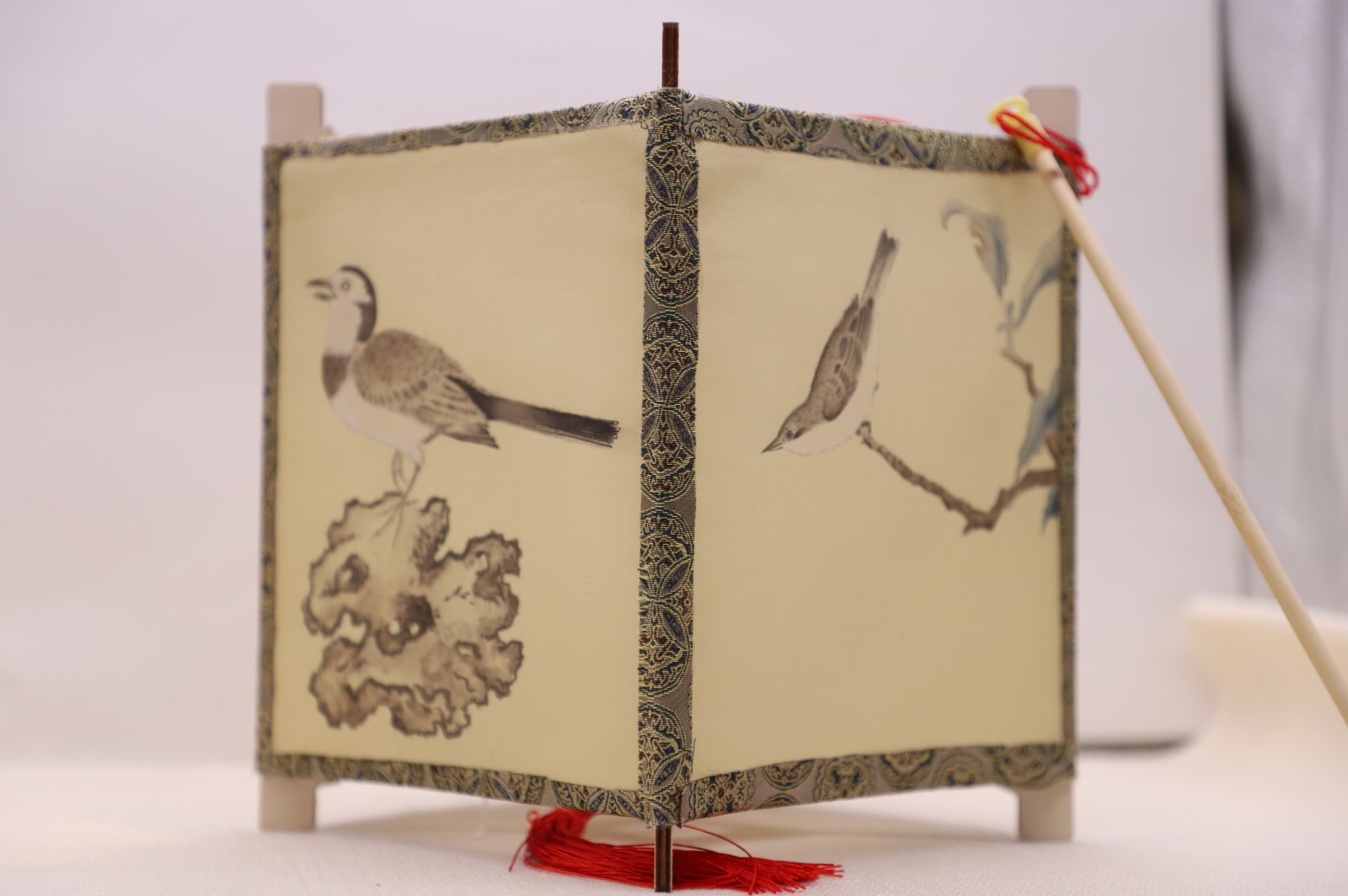 “灯笼蜡纸明空堂”,灯笼的使用在中国已有2000多年的历史,材质样式也是多种多样。这次我们围绕“杭风钱潮”的主题,以杭州西湖特色元素,例如“荷花”、“荷叶”、“栖息的鸟”为灯笼主题,用绢布做载体,使灯笼具有玲珑剔透的光泽感,手柄摇晃中,灯笼的光线变化,将绢面的花鸟画衬得更生动形象。