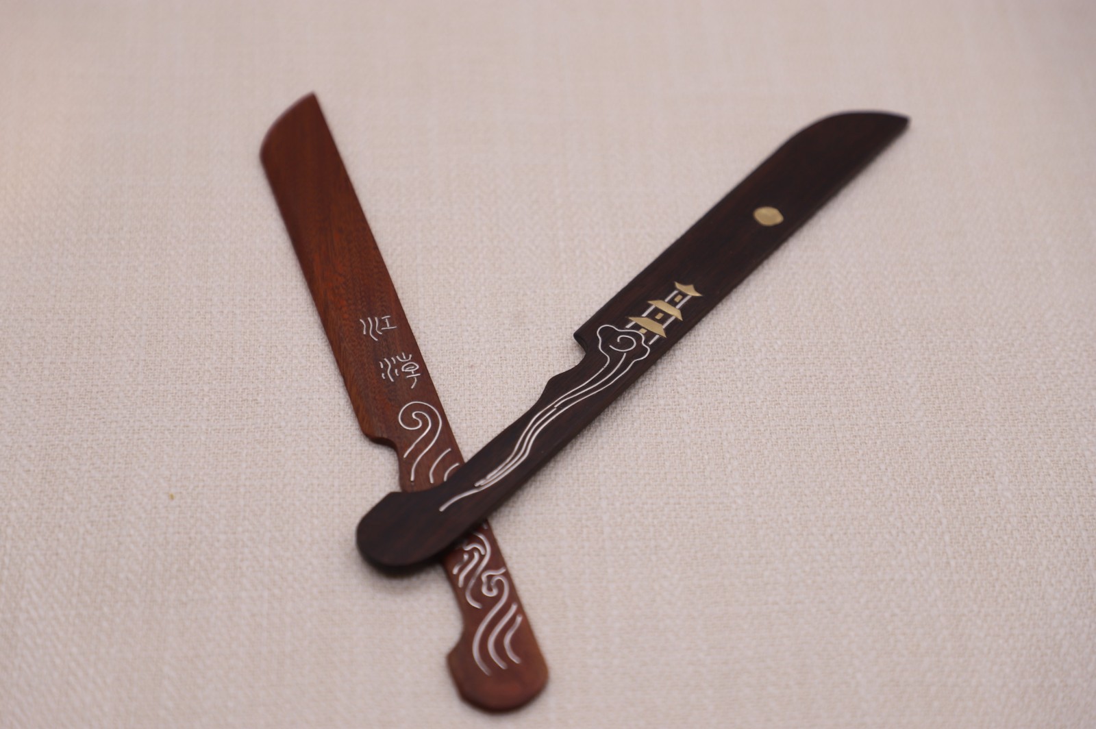 我们以国画的线条为基础,将杭州的特色元素,例如“江潮”、“亭桥”等,用镶嵌银丝或铜片的手法将银丝嵌入木质裁纸刀。增添生活趣味。
