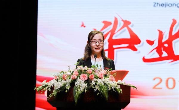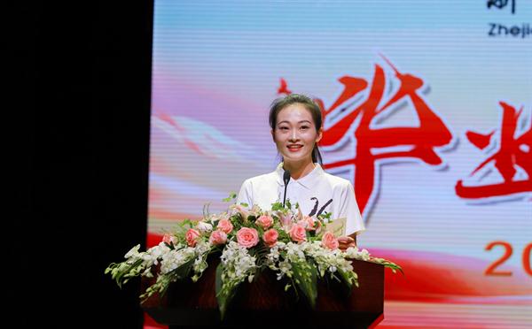 戏剧系16级演艺班学生刘欢作为毕业生代表发言:无论再过多少年,无论我们走到哪里,我们也会就着星光,回忆这生命中最美好的三年。现在,我们即将离开,今后不论身在何方,都会秉承“求真 尚美 精艺 修为”的校训不断奋斗进取,开拓创新,带着在浙艺学到的精湛专业技能、良好思想品德,迎着阳光勇敢去飞