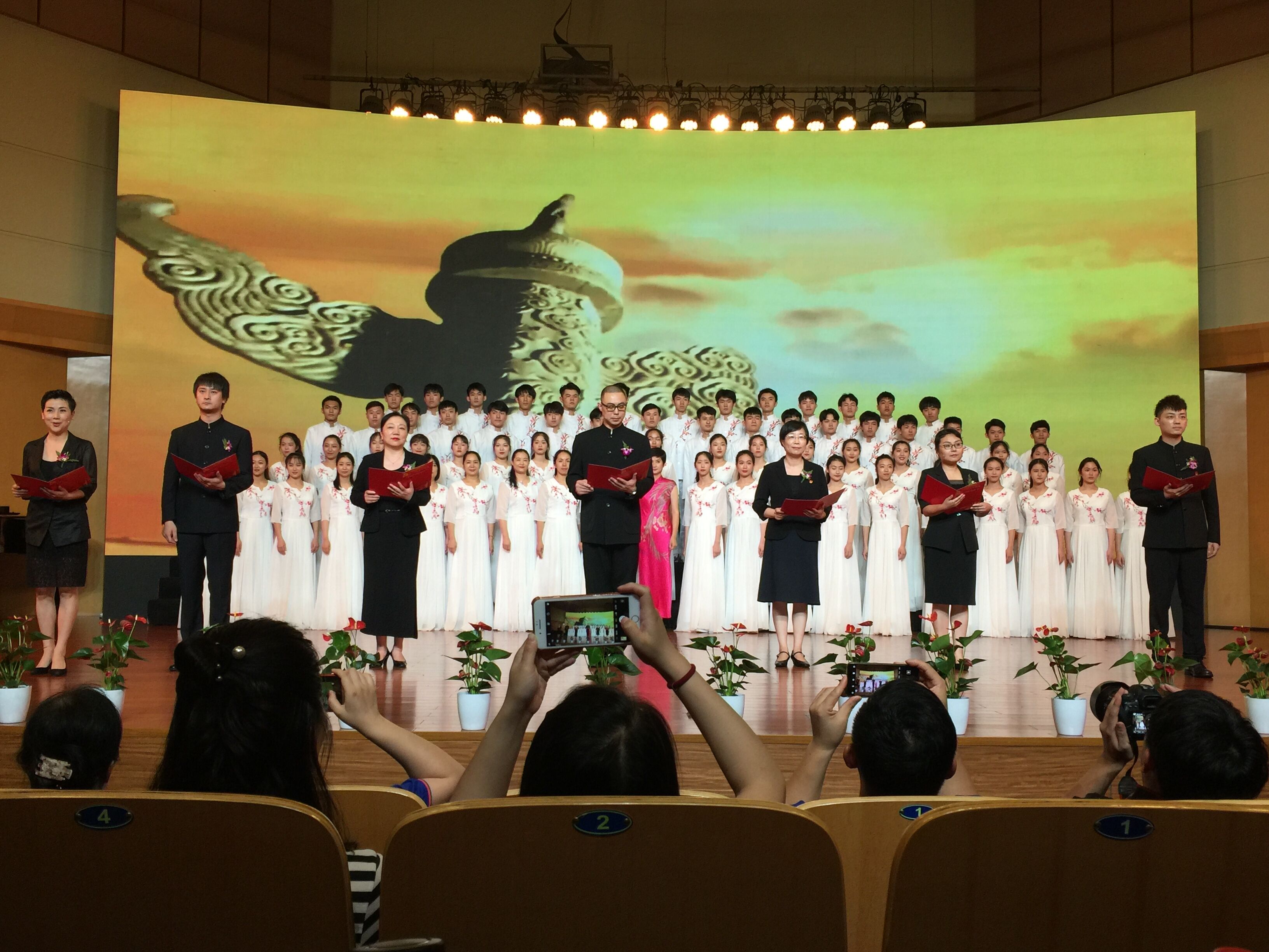 音乐系的百人合唱团阵容强大,《在灿烂的阳光下》有领唱、合唱、朗诵、乐器演奏和舞蹈等多种表现形式,台上台下呼应,慷慨激昂的歌声获得如雷般掌声。舞蹈系合唱团和影视技术系合唱团分别演唱了《保卫黄河》,各具特色,舞蹈系的红绸舞为这首歌增添了刚劲有力的气概,影视技术系的军装演出服整齐干练,两支队伍歌声嘹亮,表达了对黄河、对祖国母亲炙热的感情。“五十六个星座,五十六枝花,五十六族兄弟姐妹是一家”美术系合唱团带来的《爱我中华》,由全体党员教师和学生代表共同演唱,近年来我校积极响应教育部关于内地高校招录少数民族学生的相关政策要求,每年都录取一定比例的少数民族学生,表演的学生中有少数民族学生代表,他们用载歌载舞的形式表达中华儿女一家亲。