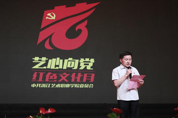 大会首先发布学校“红色文化月”品牌名称和logo,由党委组织部定义,美术系党总支报送,党员教师叶峰泉设计。校党委班子全体成员共同按下手印,启用品牌名称和logo。校党委委员、宣传部部长马向东受党委委派作了品牌logo解说,阐述了品牌logo设计理念。标志整体选择了能够全面展现我校特色的“艺”字作为主体,上半部分融入“党旗”、“长城”等元素与字体笔画结合,下半部分将“一”字与“心”字融合,展现了“艺心(一心)向党”的主旨。设计中融入我校校标优美的曲线律动,厚植“求真 尚美 精艺 修为”校训精神,秉承“心有大我、至诚报国”的爱国情怀引领全体党员“积极作为、主动担当”