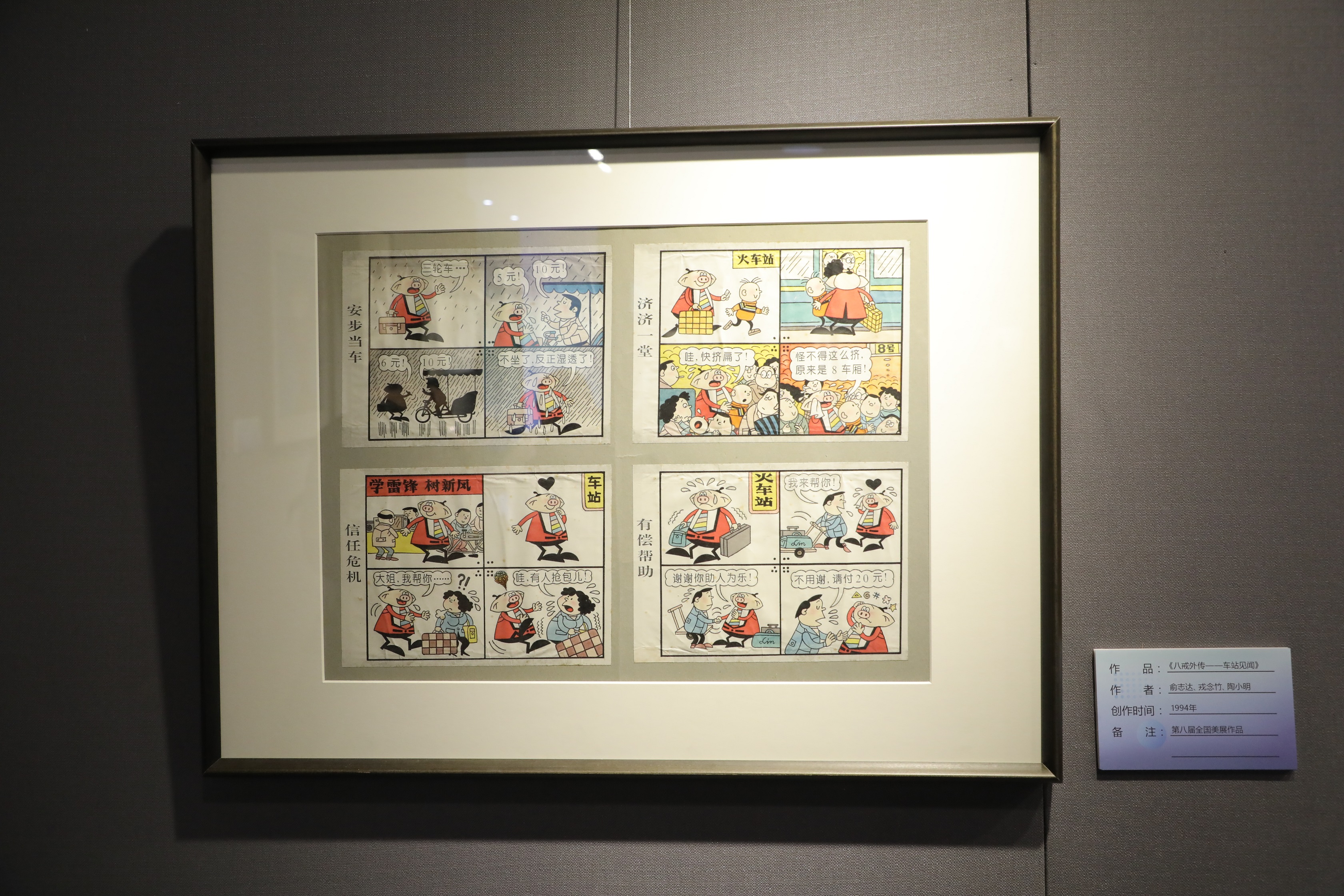 展览现场,前来观展的人很多,美术系一位动漫专业的学生说:“作品很有年代感,画风很经典。”一位广告设计专业的学生说:“这些漫画作品很有吸引力,特别有趣,希望借鉴这些诙谐幽默的漫画,融入到广告设计中。学好专业,将来给社会带来价值。”