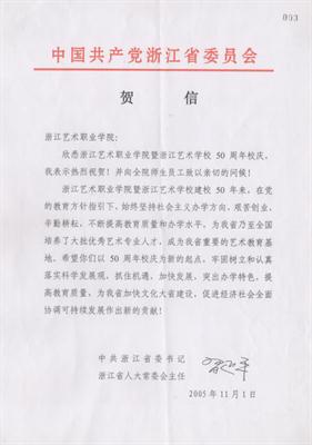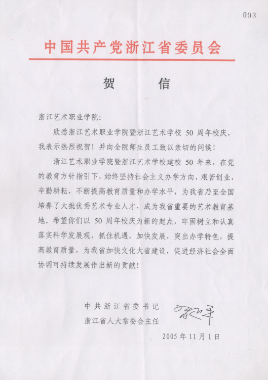 2005年11月1日,时任浙江省委书记习近平给学校50周年校庆发来贺信,肯定了浙艺建校50年来的成绩,要求学校以50年校庆为新的起点,牢固树立和认真落实科学发展观,抓住机遇,加快发展,突出办学特色,提高教育质量,为加快文化大省建设,促进经济社会全面协调可持续发展作出新的贡献。总书记的贺信为浙艺的发展树立了新航标。在贺信的指引下,浙艺人一路踏歌而行,14年久久为功,唱出了一曲曲余音绕梁、不绝于耳的文化之歌。在开展主题教育之际,重温贺信,历久弥新,总书记的谆谆教导仿佛仍在眼前,催促浙艺不忘初心、继续前进。