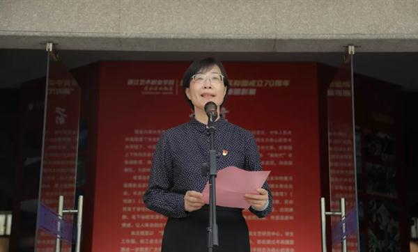钱法成致辞。他表示,非常高兴来到浙艺和师生们共同庆祝中华人民共和国成立70周年,也很开心有作品参展。他怀着喜悦的心情向师生们讲述了他青年时期的学艺经历,分享了自己70多年来的艺术之梦,勉励正值青春的同学们珍惜美好新时代的学习机会,学有所成,将来为社会服务。他祝浙艺越办越好,祝老师们身体健康。