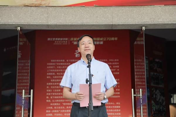 朱海闵致辞。她表示,70年沧桑巨变、70年伟大历程,在举国上下热烈庆祝中华人民共和国成立70周年之际,学校举办主题书画摄影展,表达师生们对祖国母亲的由衷祝福,抒发“奋进新时代,共筑强国梦”的澎湃激情,营造良好的校园文化艺术氛围。参展的每幅作品都源于作者的真实生活与真切感受,是新中国70年光辉历史的鲜活侧面,是几代人对国家更发展、人民更幸福的生动记忆,是中华民族迎来从站起来、富起来到强起来伟大飞跃的艺术写照,是对伟大的中国共产党、伟大的中国人民和伟大新时代的热情礼赞。