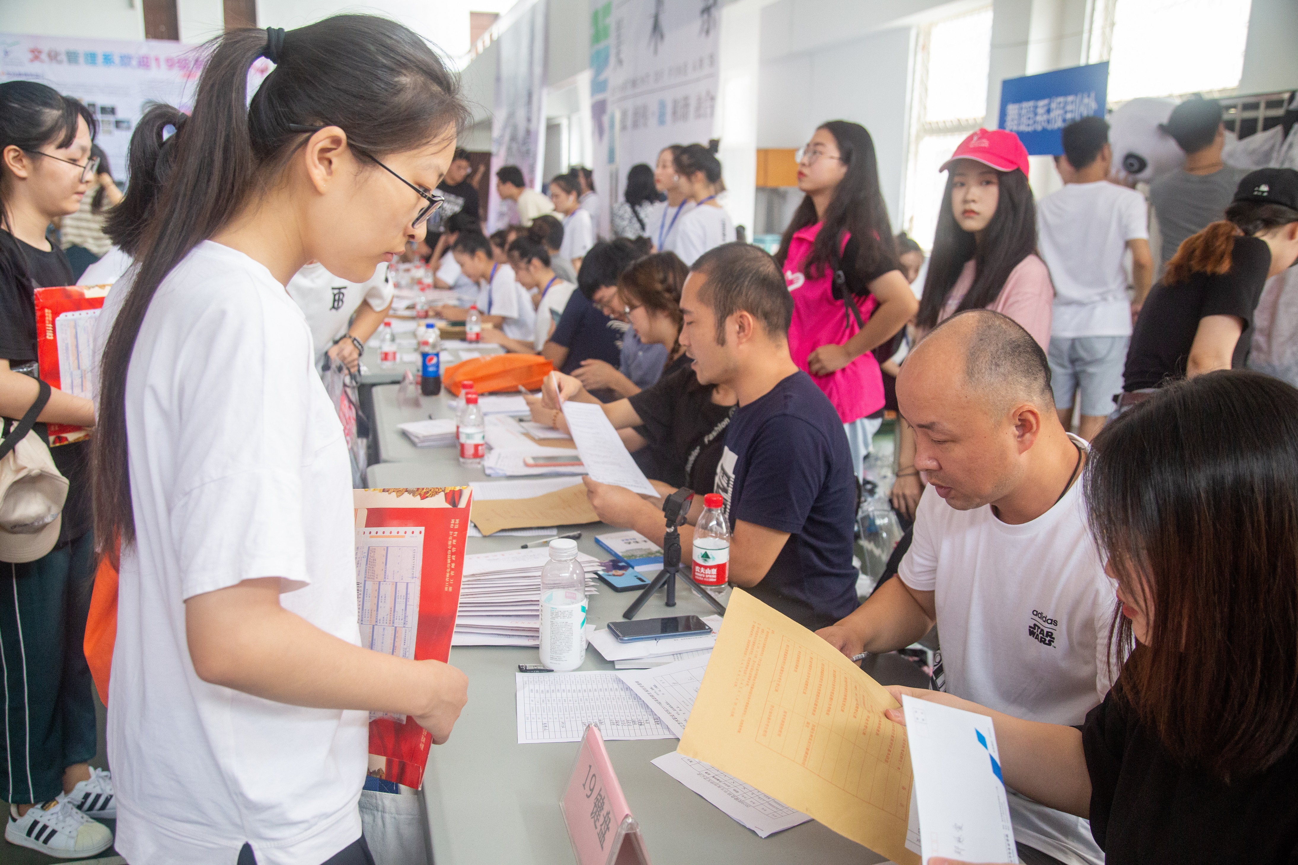9月8日上午,浙艺1108位2019级高职新生正式来校报到。一大早,火热的太阳挡不住小萌新们奔向浙艺的步伐。校门口、花坛里、艺池边……随处可见家长和新生们拖着行李的身影。体育馆里人山人海,录取通知书验证、户口转迁、学费缴纳、领取军训服,新生们在各个通道独立完成办理入学手续。