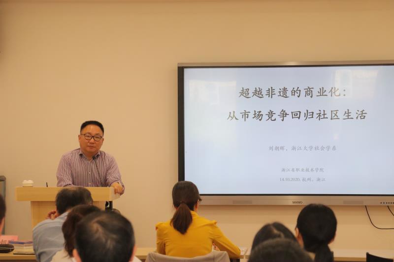 10月14日下午,浙江大学社会学系教授、博士生导师刘朝晖来校为文化管理系全体专任教师作题为《超越非遗的商业价值:从市场竞争回归社区生活》的讲座。