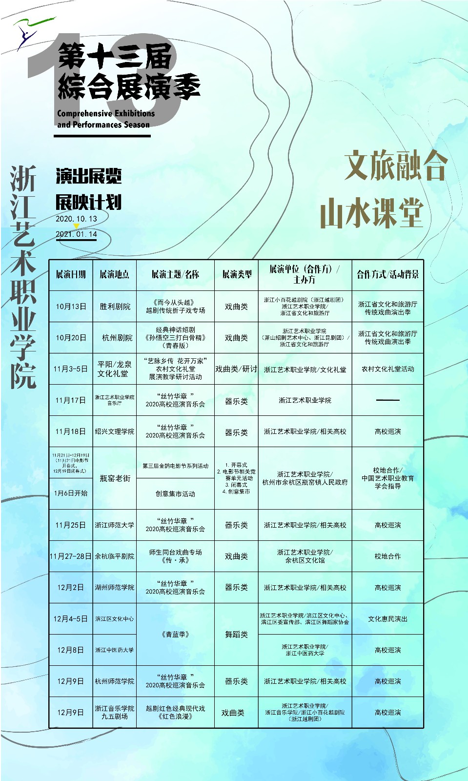 1121日,以“青春之我,奋斗之我”为主题的第三届浙艺金鹄电影节暨原创影像大赛,将在杭州瓶窑古镇拉开帷幕,同时也意味着浙艺第13届综合展演季正式启动。在1013日浙艺戏曲学院越剧折子戏专场《而今从头越》参加省文化和旅游厅“传统戏曲演出季”开始,我校综合展演季已进行了6项演出交流等活动,接下来2020浙艺民族室内乐团高校巡演音乐会、金鹄电影节、诗画浙江戏曲雅集《诗路行吟》、艺术装置陈列展览、手工艺优秀作品展览、话剧演出等将在杭州、湖州、绍兴、金华等地举行,花开浙江,艺展风华。
