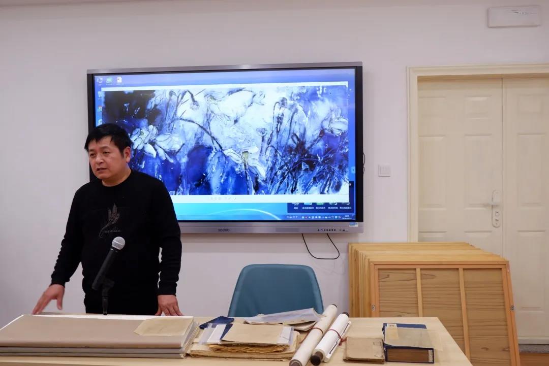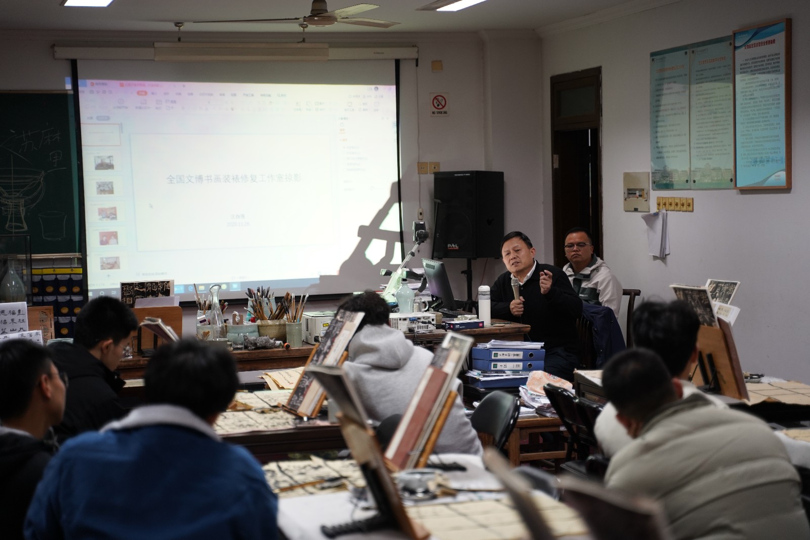 汪自强系统地介绍了当下中国文博书画装裱专业的现状与发展前景,展示了众多各省市级博物馆与各高校文物修复工作室的掠影,详细描述了不同工作室的侧重方向,以及在文博书画装裱方面具有杰出贡献的专家教授。同时,汪自强还展示了美国各博物馆修复馆室掠影,将中西方文物修复馆情况相对比,在扩充知识面的同时,也让同学们能够更好的了解中国文物修复专业的独特优势当前的不足。