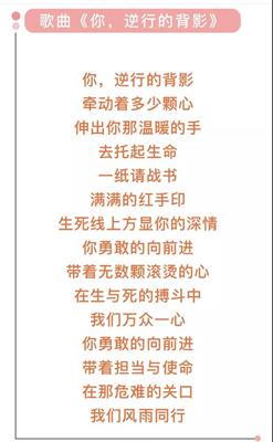 “你,逆行的背影,牵动着多少颗心。伸出你那温暖的手,去托起生命……”歌曲MV《你,逆行的背影》在浙江教育科技频道、浙江新闻频道1月28日首发,这首歌由钱建隆作词、吴大同作曲,歌唱家蔡大生、胡雁、郑培钦、浙艺校友吴晓芳、吴群和浙艺音乐系青年教师韩紫娟等参与演唱。