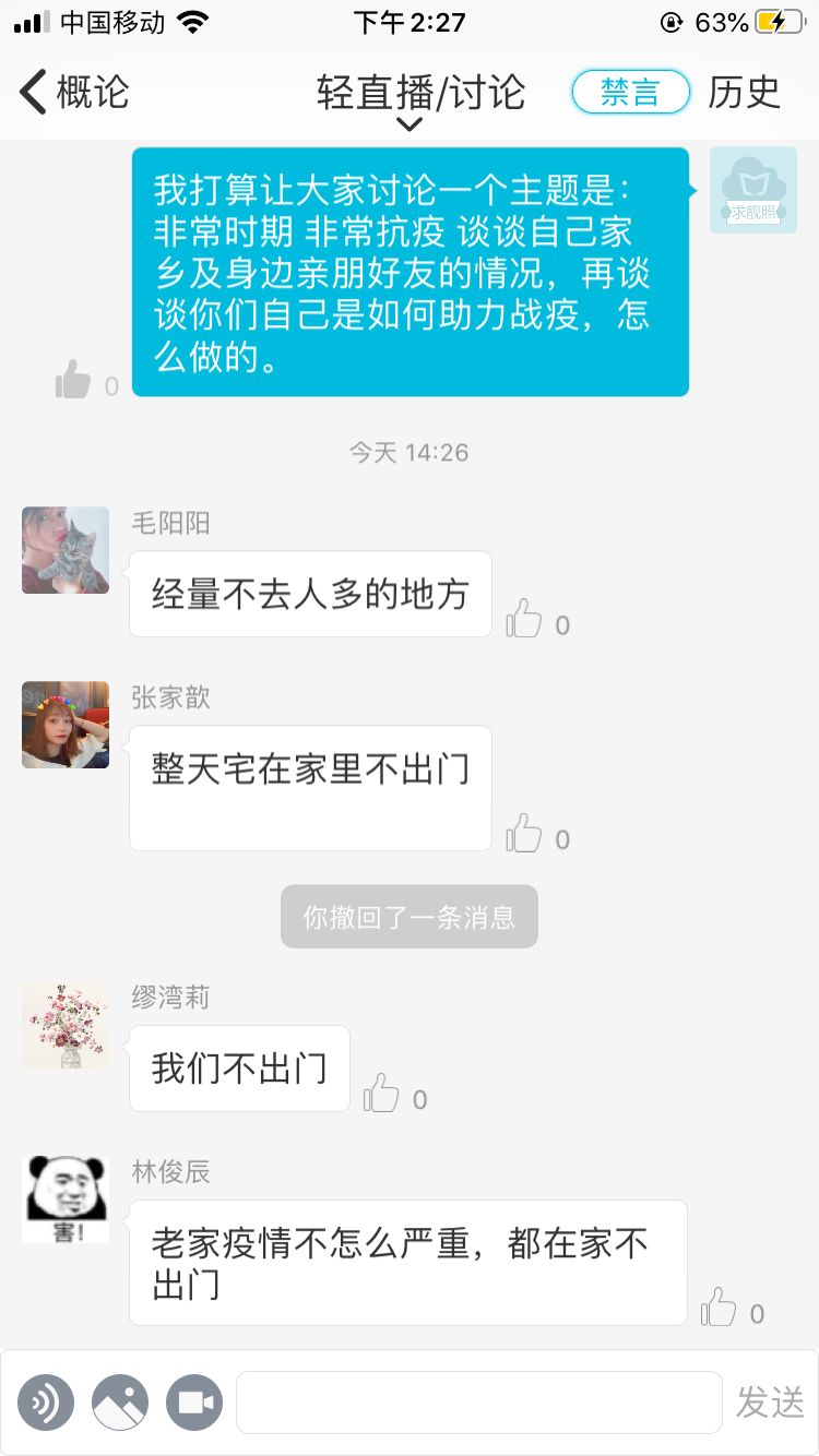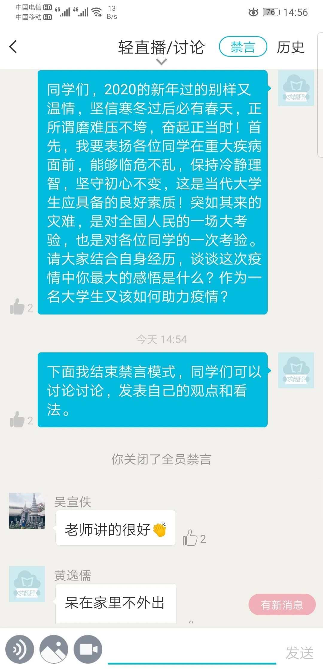 《毛泽东思想和中国特色社会主义理论体系概论》教研室分享学习强国上关于新冠肺炎疫情的资料,引导学生关注疫情发展态势。老师们运用火神山、雷神山两座医院拔地而起的真实案例,让学生认识到党在重大战役中高超的指挥能力、调配能力和统筹协调能力,领悟党集中统一的领导优势和社会主义制度的优越性,并告诫学生不信谣不传谣,坚定“四个自信”,树立“四个意识”,做到“两个维护”。运用云班课头脑风暴、轻直播讨论等功能,围绕“非常时期,非常战役”、“作为当代大学生该如何助力疫情”等主题引导学生展开讨论,同学们畅所欲言,结合自身实际发表自己的观点和看法。