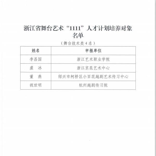 经各地申报、专家评审和公示,浙江省文化和旅游厅近日正式公布浙江省舞台艺术1111”人才计划培养对象名单,我校那刚、包峥剡、李昌国、孙强4人分别入选导演类、编创类和舞台技术类培养对象。