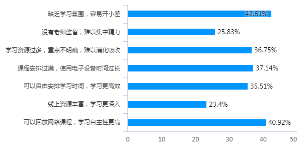 31.52%学生认为线上学习比在校学习有更好效果或效果相同,32.8%学生认为达到70%效果,12.31%学生认为学习效果不足30%。线上教学虽然总体良好,但线上、线下学习的效果仍然存在差别,线上教学还有一定提升空间。