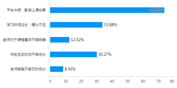73.99%学生认为平台卡顿影响上课效果,另外反映较多的是学习时间过长、互动交流不充分等问题。对于这些问题,教务处和现代教育技术中心将根据督查情况持续提出课程平台选择建议和技术设备支持,老师们也须加强线上课程交流反馈,探索更为多样有效的教学方式,着力打造高效课堂。