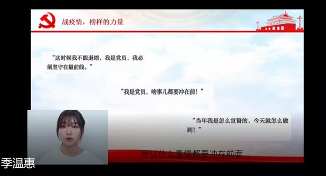习近平总书记指出,“疫情防控不只是医药卫生问题,而是全方位的工作,是总体战。”为激发入党积极分子在疫情期间的担当意识,根据入党积极分子培养总体计划,210日至223日,音乐系党总支组织第二期、第三期的40名入党积极分子培养班学员以“争做时代先锋,诠释入党动机”为主题开展微型党课宣讲,微党课以视频形式呈现,宣讲聚焦防控新冠肺炎疫情中涌现的先进人物和感人事迹,旨在教育引导入党积极分子和广大师生向战“疫”中的先锋们致敬,正确诠释好个人入党动机。