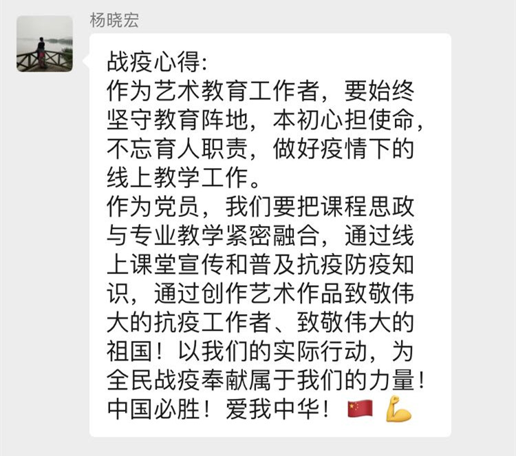 党员们纷纷在“戏剧系党员之家”微信群分享疫情防控中的体会感悟,结合工作实际抒发心声表达决心。