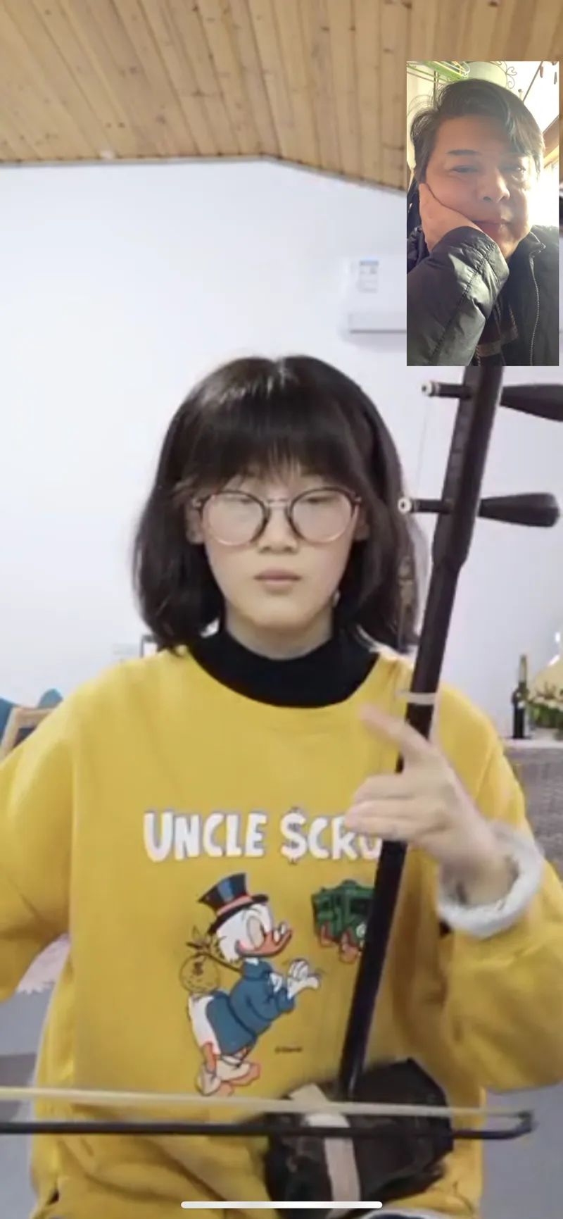 专业小课,1对1教学,一师一课表,精准施教。该类课程涉及音乐系所有非毕业班学生和所有小课老师,覆盖面广,由民乐、声乐、歌舞、管弦、键盘、流行、音乐剧等教研室承担教学。小课老师们纷纷上线,利用微信、钉钉、一起练琴、imClass、爱唱等各类网络教学神器,与学生一对一连线教学,教师的示范、讲解,学生的吹拉弹唱,你来我往、“云”音绕梁。