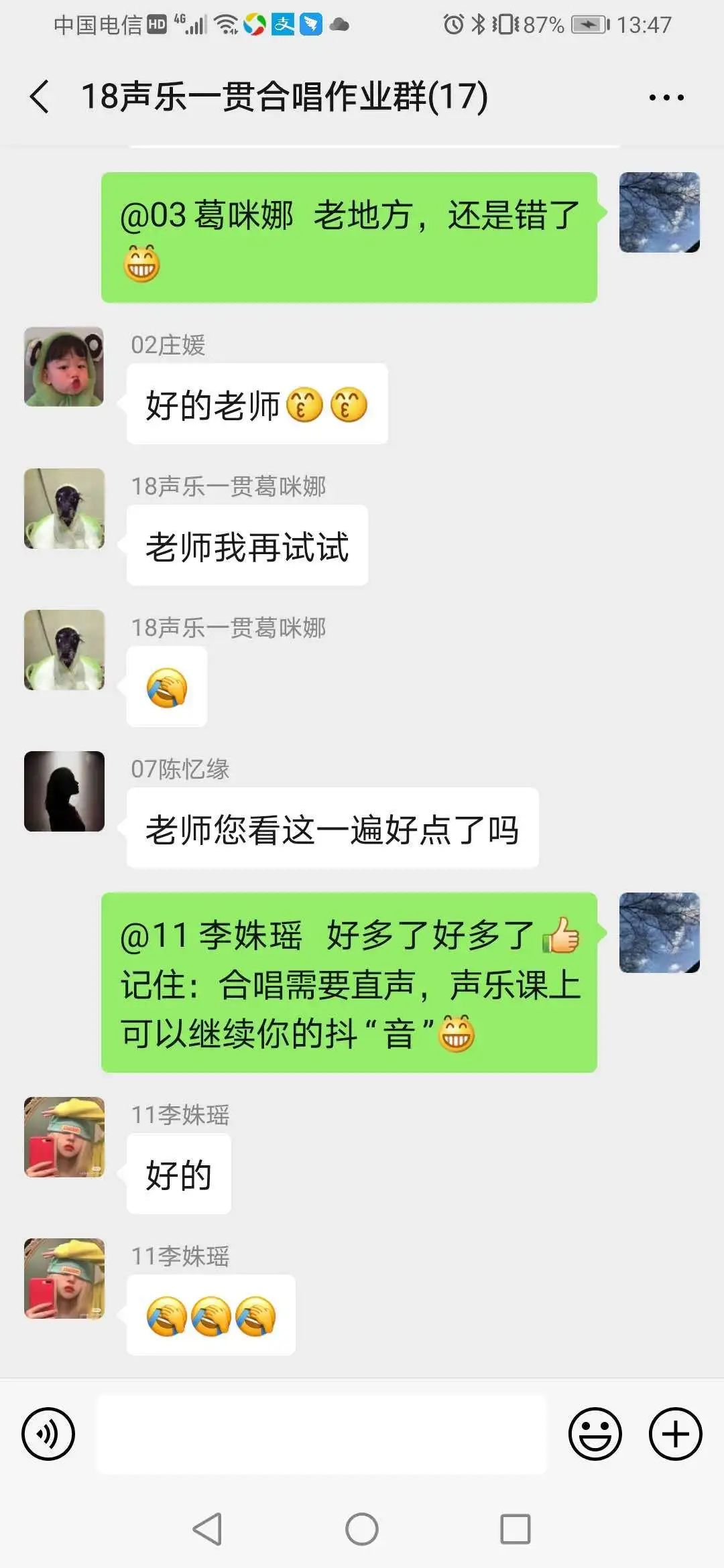 理论大课,如音乐欣赏、音乐简史、视唱练耳、乐理、音乐分析等,均为集体授课,全部由理论教研室承担教学。老师们利用自身积累的课程视频资源,结合网上共享慕课资源,录制微课、速课,制作音频和视频,通过超星学习通、云班课、微信群等开展教学,安排线上作业与测试。网络课堂上,师生间的文字、语音、视频互动,轻松而又亲切,虽然隔着屏幕,却能感受到浓浓的欢乐的学习氛围。