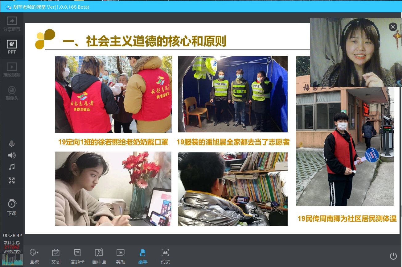 面对挑战,社会科学部制订了详实的线上教学计划,并全面启动思政教学“六个一”实施方案。由胡芊牵头的基础教研室勇挑重任,除了日常的教学内容,还编写了道德、法律、文艺专题的抗疫案例集。为了增强学生的获得感,胡芊还收集了授课班级学生的抗疫故事,让身边的模范感召学生。