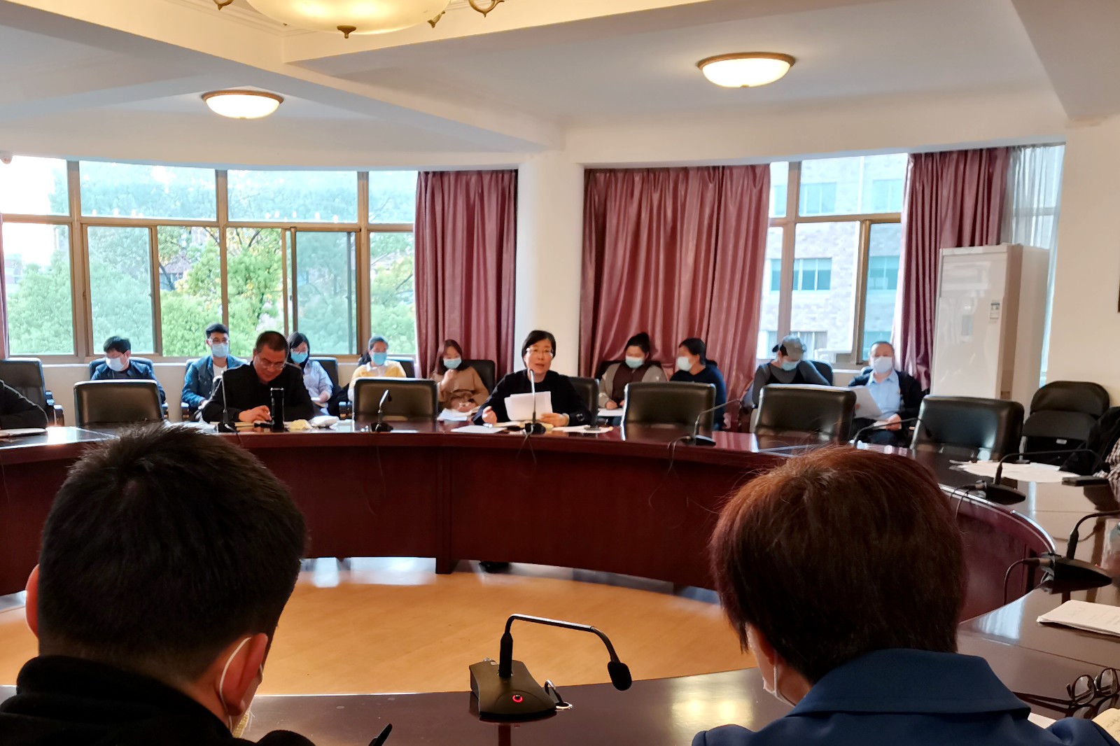 黄杭娟作讲话。她总结了学校开学前做的准备工作,肯定了各部门为打赢疫情防控阻击战,确保师生安全健康所做的努力。黄杭娟指出学校开学前已将健康信息摸排、校园环境整治、防疫物资储备、“居家隔离点”建设、防护知识培训、开学信息通知落实到位。她强调在返校过程中要把牢交通关、进校关和意识关,正式上课以后要落实体温三检制度、就餐制度,要熟悉应对突发情况的应急处置,线上线下教学同步开展,每个教职工都要强化责任担当。