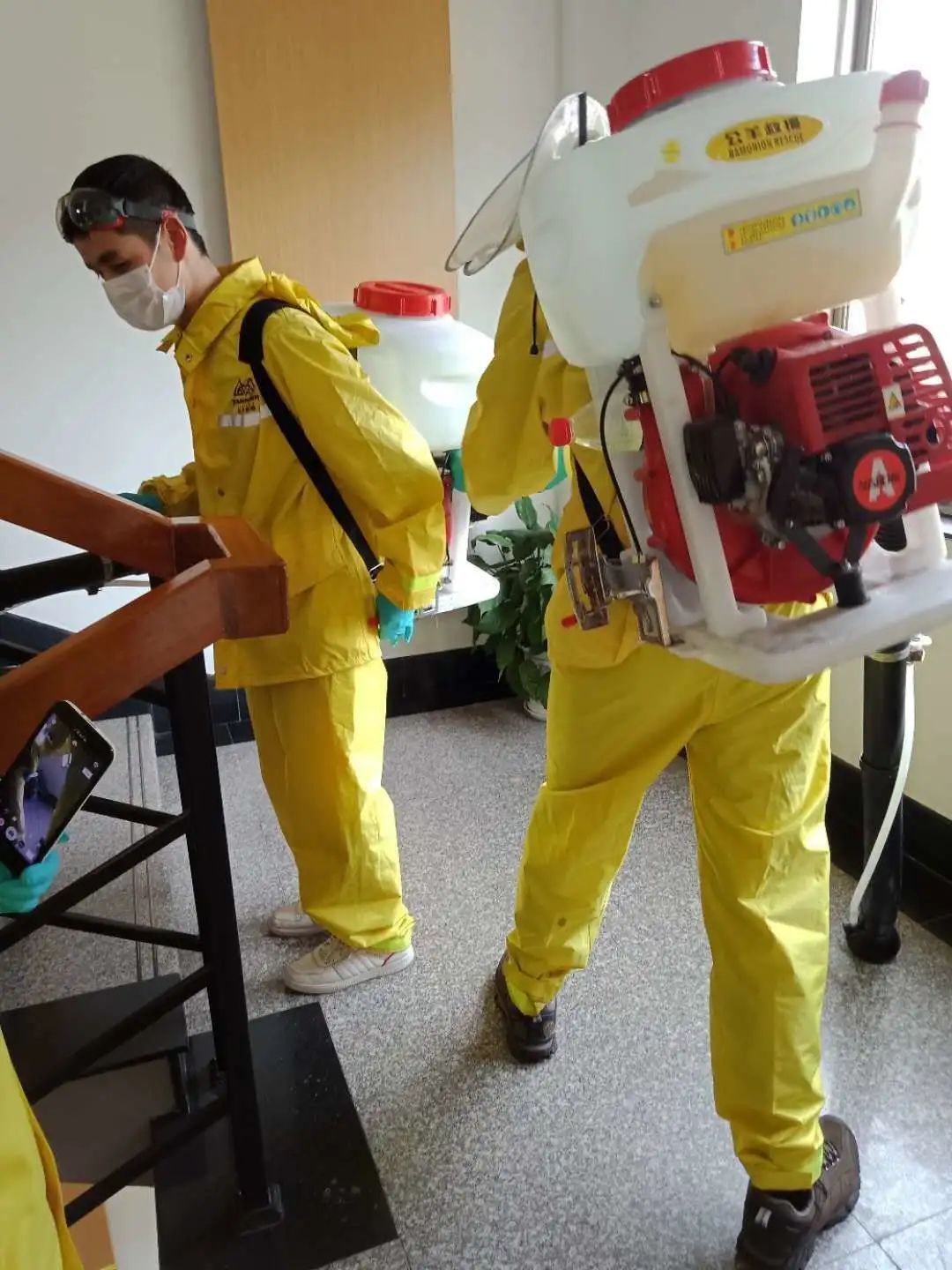 7名消杀人员携带消杀设备和消毒药水,穿上防护服,有条不紊地分工合作,熟练地调试设备、配置消毒药水,按分配区域各自展开喷洒消毒工作。在消毒过程中,消杀人员背着近60斤重的消毒液穿梭在操场、食堂、学生宿舍、教室、排练厅、报告厅、琴房、卫生间、校园走道之间进行地毯式的消毒消杀工作。遇到师生触碰率高的物品和区域,他们反复仔细消毒,不留任何死角,确保消杀彻底。